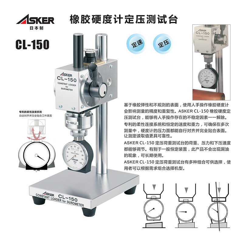 ASKER CL-150定壓荷重測試臺的荷重,壓力和下壓速度都能夠調節。有別于一般恒定裝置,此產品不會出現漏油的現象,可長期使用。
